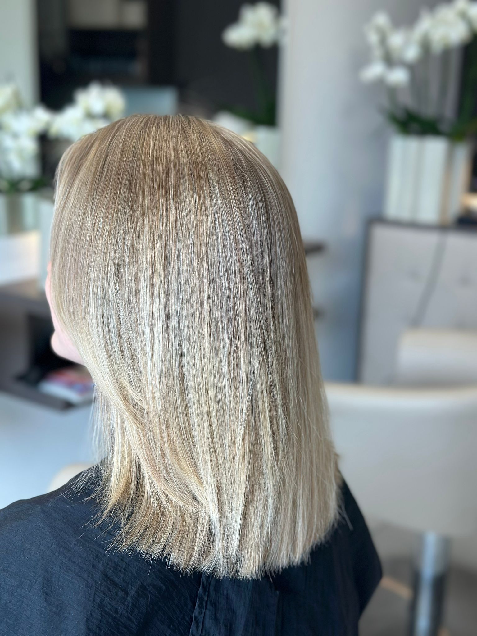 Wie ein Monat voller Sonne und Meeresbrise in jeder Strähne. Hier werden Highlights im Oberkopf gesetzt. Natürlich, harmonisch, voller Leichtigkeit, die nur zwei Nuancen heller leuchten.